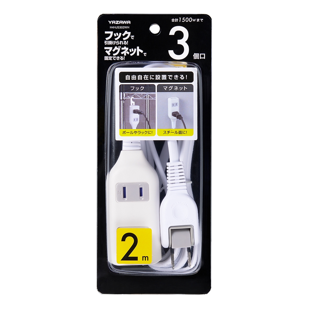 商品名 | 裏面フックマグネット付タップ3個口2m白 |