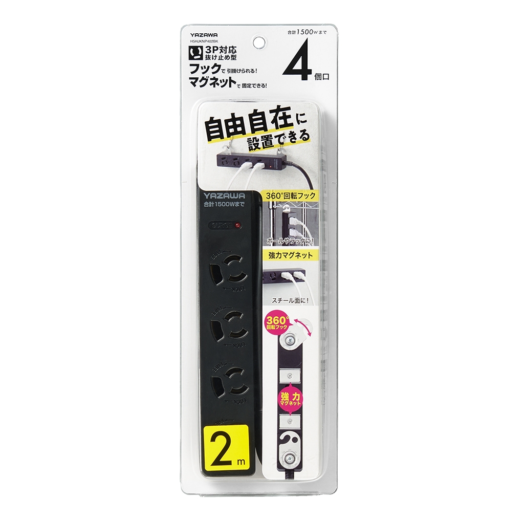 | 商品名 | 3P抜け止めマグネットフック付タップ4個口2m黒 |