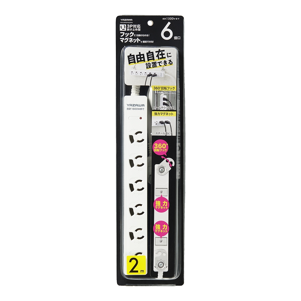 | 商品名 | 3P抜け止めマグネットフック付タップ6個口2m白 |