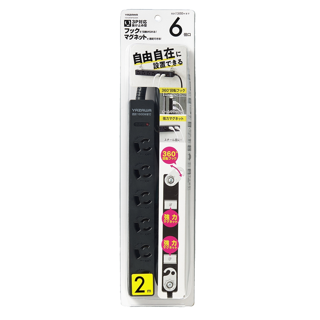 | 商品名 | 3P抜け止めマグネットフック付タップ6個口2m黒 |